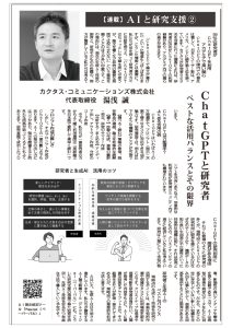 科学技術の進歩に寄与し、豊かな社会発展に貢献する専門紙『科学新聞』にて、カクタス・コミュニケーションズ株式会社代表取締役・湯浅誠の記事が連載中です。第2回は「ChatGPTと研究者 ベストな活用バランスとその限界」と題し、カクタスが7月に発表したアンケート調査でもアカデミア内での関心の高さが伺えたChatGPTについて、よくある活用の例やプロンプト作成の難しさ、研究利用に限界がある理由、研究者と生成AIのベストなバランスなどについて語っています。