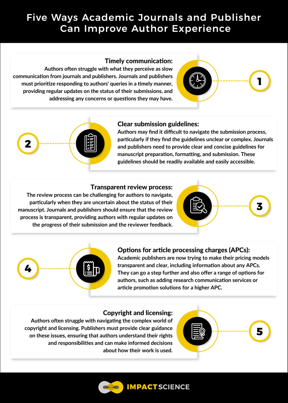 As authors are increasingly required to publish open access, journals too are prioritizing author experience to attract high-quality research, retain authors, enhance their reputation and impact, facilitate collaboration, and meet funding and policy requirements. In addition to focusing on libraries and readers, journals are now thinking about how to serve authors. This requires a deep understanding of the challenges authors face while interacting with journals, especially during the publication process. Below is a handy infographic on five main areas in which academic journals and publishers can improve author experience.