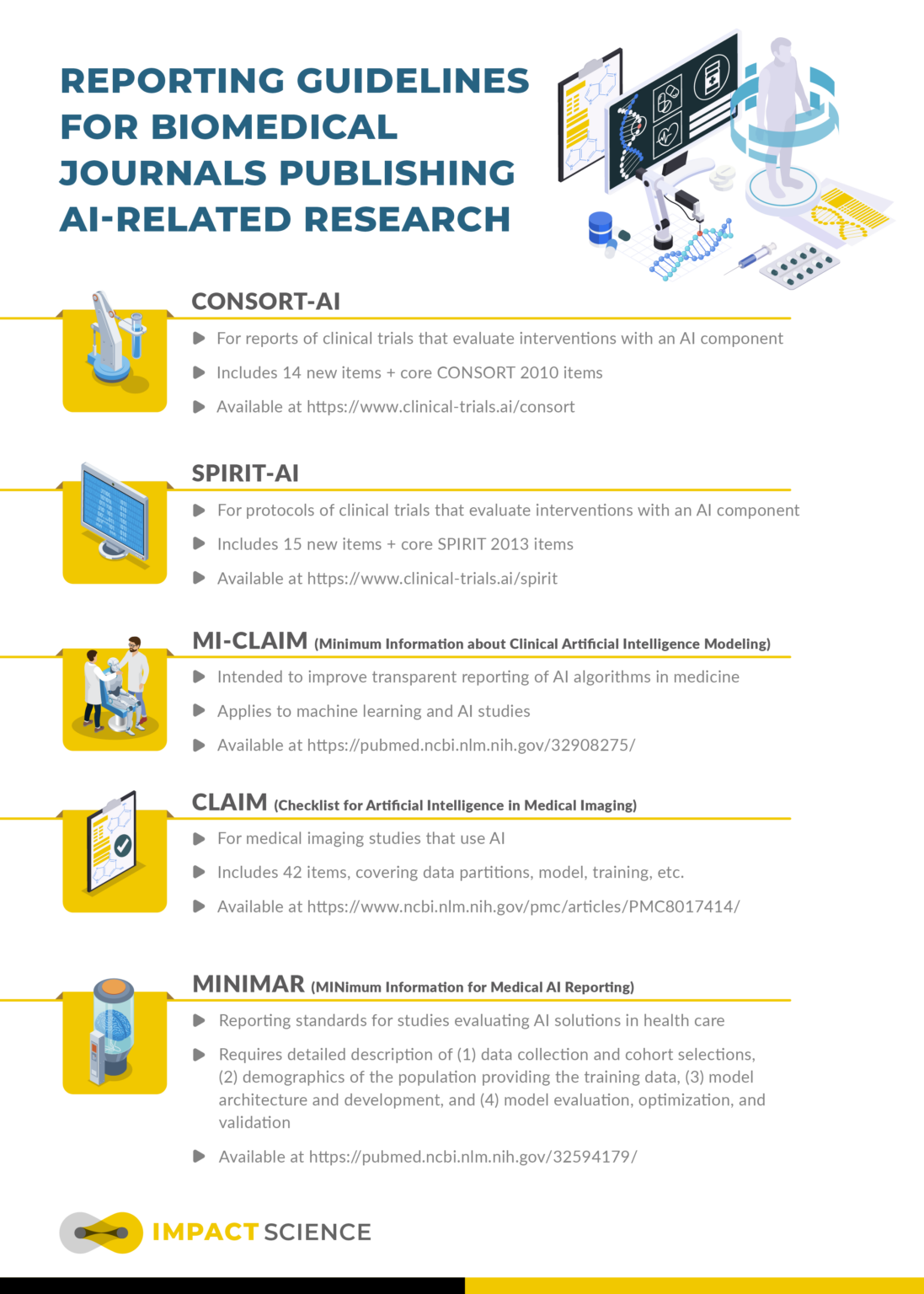 The below infographic aims to elucidate different AI-related guidelines tailored for medical journal publications. By fostering transparency, accountability, and adherence to best practices, these guidelines not only enhance the quality of AI-driven research but also safeguard the integrity of medical literature, ultimately advancing patient care and outcomes.