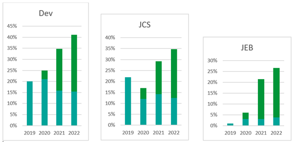 The growth in our Read & Publish initiative is the driving force behind this increase in Open Access content. [R&P shown in green in the charts below.] Our agreements cover more institutions each year, so even more authors are delighted to be offered fee-free Open Access. Journal of Experimental Biology started at the lowest level of Open Access content and so saw the biggest jump up. All three journals met their OA targets again for 2022 and we’re really pleased with the progress we’re making.